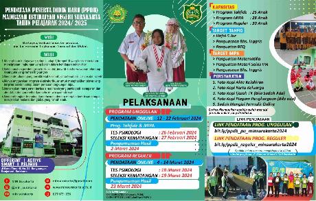 Jangan lewatkan PPDB Tahun ini di bagi menjadi dua gelombang Gelombang pertama di awali dari pendataan Program Unggulan Tahfidz dan MIPA Gelombang kedua pendataan program Reguler Jadwal pelaksanaan sesuai dengan brosur Link pendataan sebagai berikut PROGRAM UNGGULAN http://bit.ly/ppdb_pu_minsurakarta2024 PROGRAM REGULER http://bit.ly/ppdb_reguler_min...